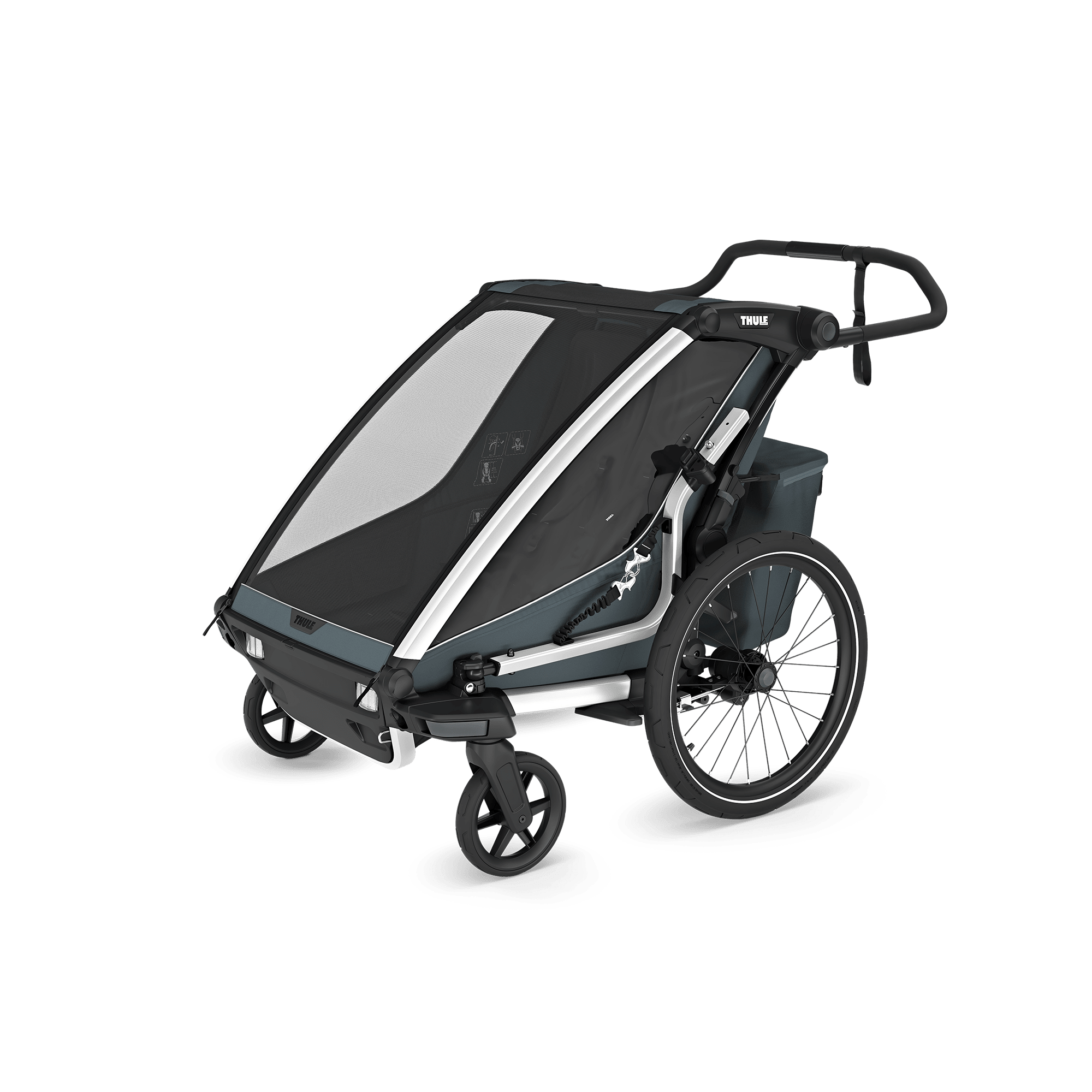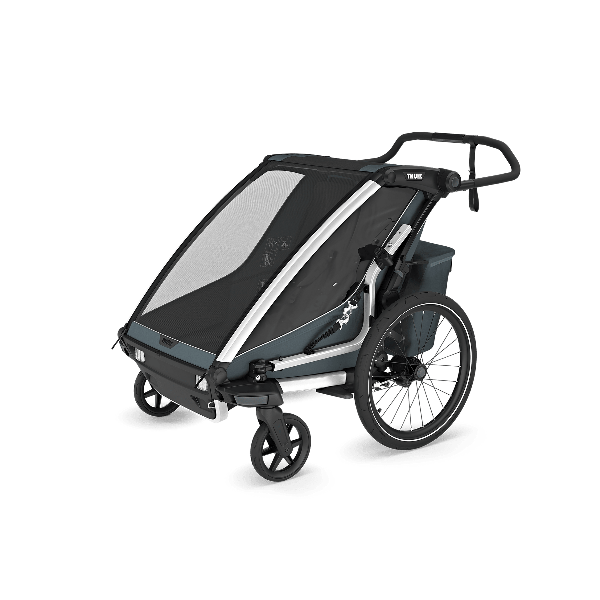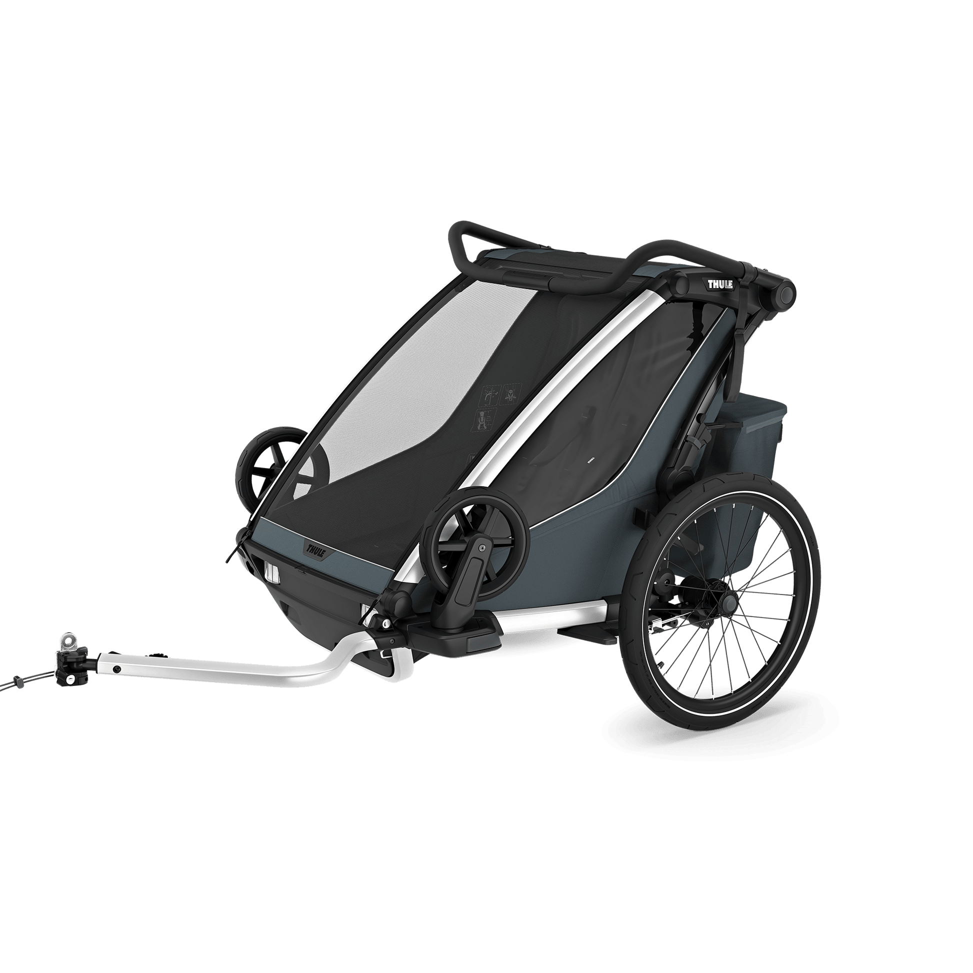 Der Thule Chariot Cross 2 double (dunkler Schiefer) ist ein Multisport-Fahrradanhänger für 1–2 Kinder mit modularer Liege-Sitzlösung, einhändiger Deichsel-Befestigung mit integriertem Schloss, verstellbarer Federung, Regenhaube & Sonnendach sowie Thule Delight Rückleuchte inklusive.