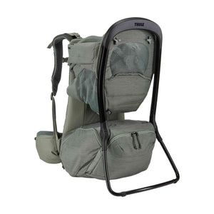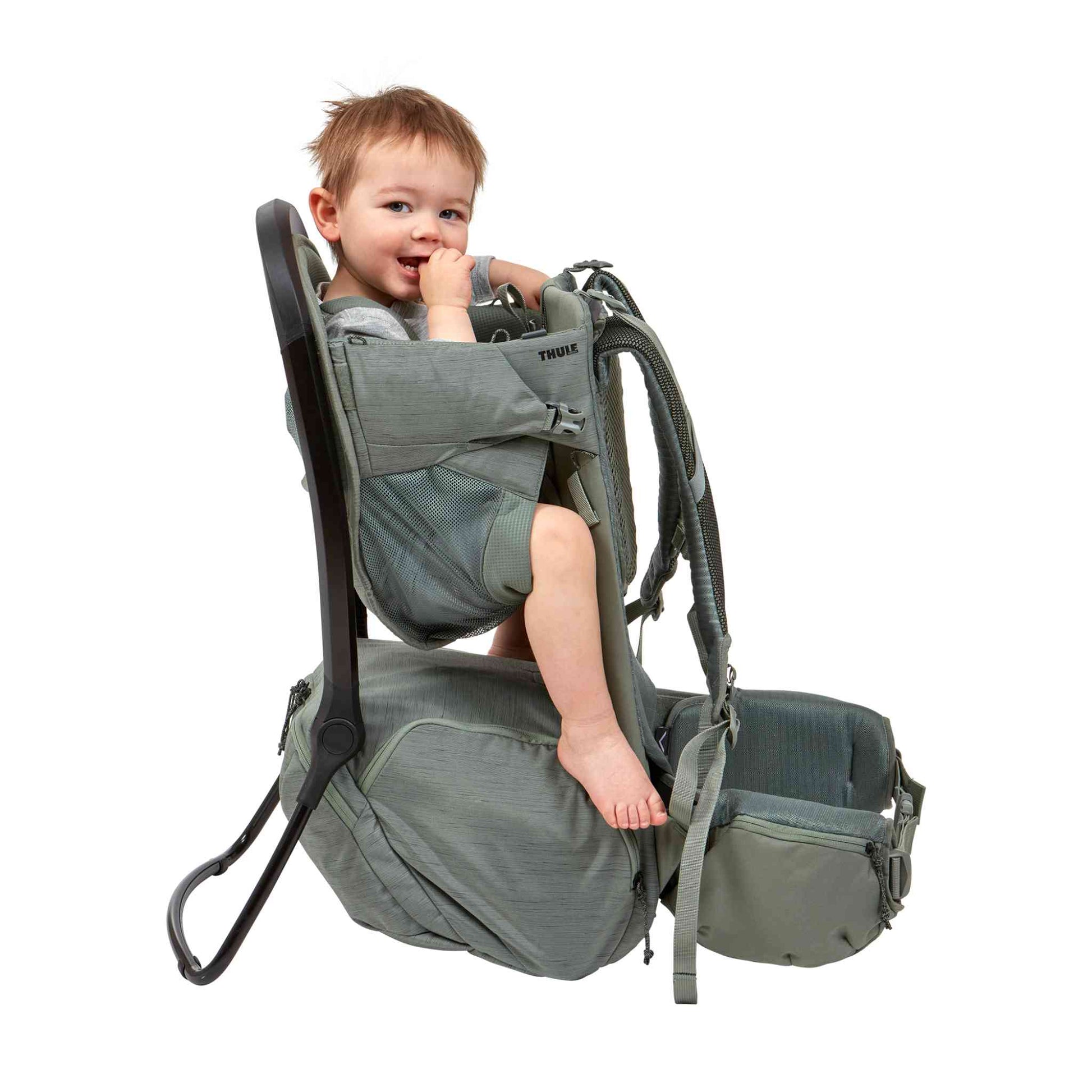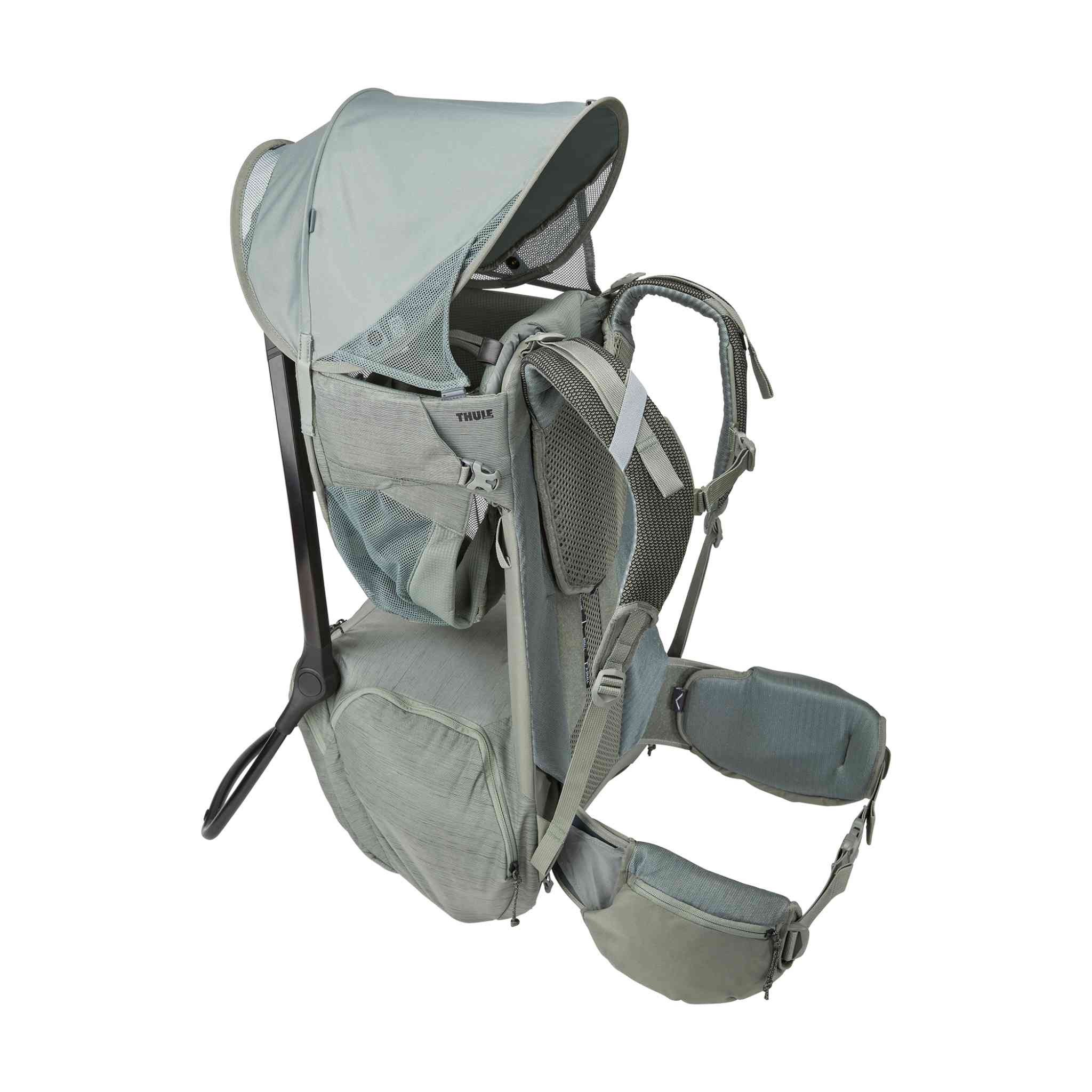 Komfortable Outdoor-Kindertrage mit verstellbarem Tragesystem, integrierter Belüftung und Sonnenschutz – ideal für Wanderungen.