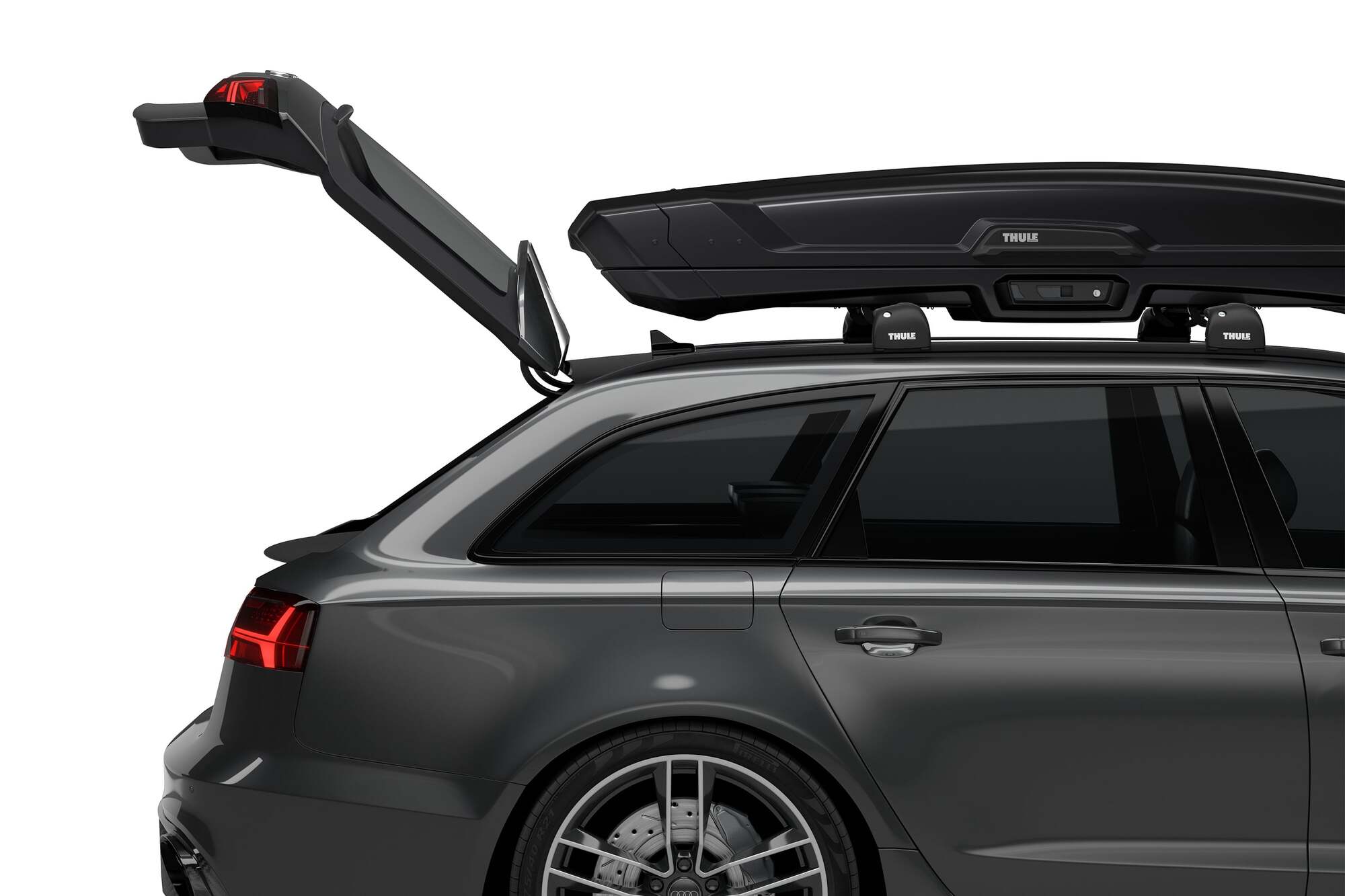 Thule Vector L (613700): Premium-Dachbox mit 430 L Volumen, Filz-Innenausstattung, integrierter LED-Beleuchtung, PowerClick-Schnellmontage, SlideLock-Verriegelung und beidseitiger Öffnung – inklusive Thule Box Lid Cover.